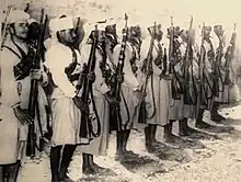 As the fronts turned into a stalemate in the First World War, Imam Yahya, the Zaydi imam of the time, became worried about what would happen to himself and Yemen. In order to avoid any harm to himself, Imam Yahya began to think of leaving Lahij to the British and asking for the opening of sea lanes and the stopping of British and Seyyid Idrisi attacks in return.[19] On 30 October 1918, he signed the Mudros Armistice of the Ottoman Empire.[20] After this situation, Imam Yahya entered Sana'a and declared the independence of Yemen, and 3 days after independence, Imam Yahya declared himself the ruler of the Zaydi Emirate of Yemen.[21][22][23] According to the armistice, the Ottoman Empire was to withdraw from all of Yemen, but the governor of the city, Mahmut Nedim Bey, and the commander of the 40th Division, Galib Bey, did not comply with this order for 45 days. Corps Commander Ahmet Tevfik Pasha paid a small amount of the soldiers' overdue salaries from the Provincial coffers. Imam Yahya stated that he would not object if the corps decided to surrender the Corps units, and he requested that some of the weapons and ammunition in the troops be given to him as a precaution against possible attacks in the future, but some commanders objected to this.[24] Taiz Operations Regional Commander Ali Sait Pasha took the initiative and went to Aden and met with the British. Since Ahmet Tevfik Pasha took the time to evacuate Yemen, the British ordered VII. The corps and Yahya's delegation sat at the table with the British, but no result came out of this negotiation.[25] The resistance continued for 1 more month, then VII. The Corps and the 40th Division handed over most of their ammunition to Imam Yahya and sold the rest to the tribes to provide subsistence to the soldiers. On January 23, 1919, the last Ottoman force surrendered to the British.[26] Although most of the officers had left, Mahmud Nedim Bey and 200 Ottoman officers were still detained by Imam Yahya in Sana'a.[25][27][28] The civil servants who stayed in Yemen repeatedly wrote letters to the governments of Istanbul and Ankara for the payment of their salaries until the Treaty of Lausanne was signed.[29] In a letter dated October 13, 1923, he stated that it was appropriate and necessary for the Yemenis to establish their own administration, that it was not possible to meet the financial demands, but that the necessary experts or civil servants were needed for organization. It was written that Turkey could help, provided that their salaries were paid by the Yemeni administration. They held important positions such as Mahmut Nedim the governor of Sana'a and Ragıp Pasha the minister of foreign affairs.[30][31] İmam Yahya wanted Mahmud Nedim Bey, whose official duty ended after the Treaty of Lausanne Peace', to stay in Yemen. However, Mahmud Nedim Bey returned to Turkey in 1924.[32] Then he tried to bring the remaining Turks to Turkey. In 1926, some civil servants returned to Turkey. The Turks who remained in Yemen intermarried with the locals, and most of them were later presumed dead by those in Turkey.[33]