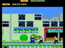 The arcade version consists of three different levels, each continuing in an endless loop until the player runs out of lives. It starts out with the player character (named Takeshi in Japan, and Steven according to the European arcade flyer)[8] on a city street watching as a street thug runs off with his girlfriend (named Remy, also according to the arcade flyer, Mari in Japan). As he pursues him, he must fight off gangs of other various street thugs. Halfway through the level, Steven has an opportunity to save a captive bystander who (if rescued) will help him fight until the bystander is killed. Soon (after jumping across platforms and dodging fireballs) Steven arrives on a beach and fights the thug that has captured Remy. After the level boss is defeated by after being hit 10 times, the level is complete. This same process repeats for the remainder of the game, only with two other bosses and stage designs. The second stage design resembles an Edo Japanese ninja epic, with ninja themed enemies and boss, followed by a sci-fi theme loosely based upon Planet of the Apes, including ape/human enemies and a boss.