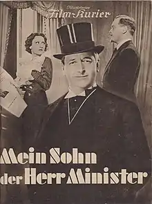 My Son the Minister (German: Mein Sohn, der Herr Minister) is a 1937 German comedy drama film directed by Veit Harlan and starring Hans Brausewetter, Heli Finkenzeller and Françoise Rosay.[1]