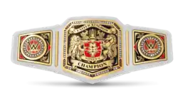 The championship belt was revealed during the 25 August 2018 tapings of NXT UK.[5] It was nearly identical to its male counterpart, the NXT United Kingdom Championship. Like the United Kingdom Championship, the center plate was modeled after the United Kingdom's royal coat of arms, featuring a lion and a horse (instead of the traditional unicorn) on either side of the arms, while at the center of the plate featured a shield with the NXT UK logo; atop the shield were the crown jewels.[5] Above the arms was a banner that read "United Kingdom", directly below the shield was a banner that read "Women's", and below that was a banner that read "Champion". Gold divider bars separated the center plate from the belt's two side plates. In what became a prominent feature for WWE's championship belts, the two side plates featured removable center sections that could be replaced with the reigning champion's logo; the default side plates featured the WWE logo on a red globe. Like the Raw and SmackDown Women's Championship belts, the strap was white and smaller than the men's.[12]