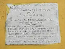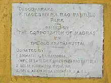 Nageswara Rao Park was originally called Arathakuttai (big pond).[6] In deference to a request by the Chennai Corporation, the owners of the pond, Ramayamma Pantulu, Aravamutha Iyengar and Nainiappa Mudaliar, donated the pond to the civic body for creating a park. After its creation, the park was named after Desodharaka Nageswara Rao Pantulu.[7] It was opened to the public by P. S. Kumaraswamy Raja, the then Chief Minister of Madras, on 20 October 1940. Originally developed in a much smaller area on Luz Church Road, the park was expanded when more land was donated by Ramayee Ammal, M. Nainappa Mudaliyar, V. Kumaraswamy Raja, Vinjamur Govindarajachari and Aravamadhu Iyengar in the same year. In 1996, the Chennai Corporation re-developed the park and started maintaining it.[8] A pond known as Aaratha kuttai was filled in and made into a garden.[9] It was Nageswara Rao, founder of the neighbouring Amrutanjan factory, who convinced the local residents to develop the area when the pond began to dry up.[9] It is in his memory that the park was named after him.