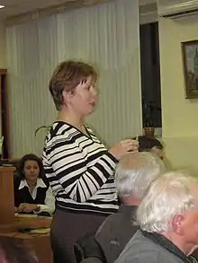 Natalya Grigorevna Sharina (Russian: Наталья Григорьевна Шарина; born 13 July 1957) is the director of the Ukrainian Literature Library in Moscow. She was put under house arrest in 2015 under the charges of inciting ethnic hatred and spreading "anti-Russian propaganda". In 2016, Sharina was put on trial for disseminating banned literature and embezzling library funds.[1][2][3]