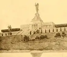 It was decided in early 1912 that the memorial would be designed by a sculptor, an architect, and a landscape architect.[14] A $250 contest in 1910 for the contest had produced no credible results.[16] The sculptor Cyrus Edwin Dallin offered to design the sculpture, though he was not selected.[14] After Burnham & Company turned Dixon's request for design help down, the architects Thomas Hastings and Daniel Chester French agreed to handle it, though they were members of the United States Commission of Fine Arts, which would be responsible for selecting and approving the final design. The two later withdrew over allegations of impropriety.[16] They produced a preliminary sketch, though not a formal design.[11] A brochure from the dedication also spoke of a museum of Native culture under the statue.[17] Some criticized the memorial, including the architect Charles Moore, also a member of the Commission of Fine Arts, who described it as an "ungainly Indian on the roof of a Greek temple".[14]