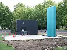 The memorial was built to a design by Lord Foster of Thames Bank and Danish designer Per Arnoldi, on the corner of The Mall and Horse Guards Road, directly outside the Old Admiralty Building.[6] The site was occupied at the time by an air shaft on the Bakerloo line of the London Underground.[4]