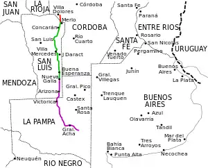 Formerly,[1] this route had a length of 761 km, up to the link with National Route 35, in the town of Perú, La Pampa Province, that is, the complete route indicated on the map. The section to the south of Nueva Galia, in San Luis, marked in purple and unpaved, passed to provincial jurisdiction through National Decree 1595 of 1979,[2] except for the section between km 263.87 and 296.78 that corresponded to the overlap with National Route 152. The Province of San Luis accepted the transfer in 1981.[3] The section between Villa Dolores and Villa Mercedes was paved in 1967, while the section between Nueva Galia and Villa Mercedes was paved in the first half of the 1970s.