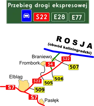 National road 54 (Polish: Droga krajowa nr 54) is a route belonging to the Polish national road network. The highway is a GP-class road,[1] 18 km (11 mi) long, located in the Warmian-Masurian Voivodeship. This route connects the Expressway S22 at the Braniewo-Południe junction near Chruściel with the Gronowo-Mamonovo border crossing near Russia.