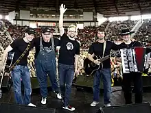 Nenhum de Nós (Portuguese for None of Us) is a Brazilian pop rock band formed in 1986 in Porto Alegre, Rio Grande do Sul. The band primarily consists of former Engenheiros do Hawaii member Carlos Stein (guitar), João Vicenti (keyboards), Sady Hömrich (drums), Thedy Corrêa (lead vocals) and Veco Marques (guitar). One of the most famous Brazilian pop rock bands, they are well known for the song "Camila, Camila".