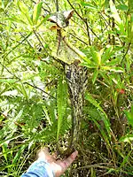 Nepenthes rafflesiana is a scrambling vine. The stem may climb to a height of 15 m and is up to 10 mm thick. Internodes are up to 20 cm long.[4] Tendrils may be over 110 cm long.