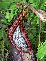 The giant form is a much larger plant than the typical form in all respects. The stem may climb to a height of 15 m. Leaf blades are around two and a half times as long as usual. Lower pitchers reach 35 cm in height by 15 cm in width and sometimes exceed 1 litre in volume, making them some of the largest in the genus.[16] They vary widely in pigmentation, from white with red blotches to dark purple. Upper pitchers may be spotted or green throughout. The inflorescence is also massive, reaching over 1 m in length. The individual flowers measure up to 1.5 cm in diameter and have dark red tepals.[16]