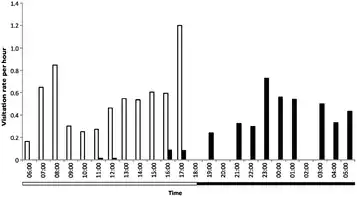 Left: Mammal visitation rates to N. rajah pitchers. White bars show visitation by T. montana and black bars by R. baluensis. The horizontal bar below the x-axis indicates photoperiod, white representing daylight hours and black nighttime.[38]