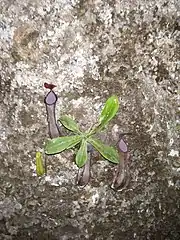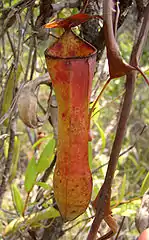 Upper pitchers are typically somewhat infundibular in the lowermost part, becoming narrowly ovoid in the lower third, and finally cylindrical and slightly narrower above. They may be quite large, reaching 25 cm in height by 5 cm in width.[5] The waxy zone of the inner surface is well developed.[8] A pair of remnant ribs is present in place of the ventral wings.[5] The inner portion of the peristome accounts for around 40% of its total cross-sectional surface length.[8] Other parts of aerial pitchers are similar to their lower counterparts.[5]