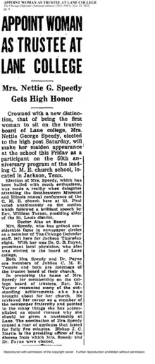 She is a well-known journalist with the Chicago Defender. She wrote on courts, crime, theater, and sports and advocated for African Americans, particularly African American women. Nettie Speedy was the 1st woman to become a trustee at Lane College in Tennessee.[8] According to "The Chicago Defender (National Edition) (1921–1967); November 12, 1932; page 4," Mrs. Speedy, who has earned notoriety in newspaper circles as a member of the Chicago Defender staff, became the first woman to serve on the board of trustees at Lane College.[9]