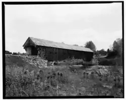 New Henniker Bridge or New Bridge was a covered bridge in West Hopkinton, New Hampshire, which carried Henniker Road over the Contoocook River. The truss bridge was completed in 1863, and was the second bridge on the site. The original stone arch bridge was built in 1845 and was washed away by flood in 1852. The bridge was just over 20 feet (6.1 m) wide and 180 feet (55 m) long, and consisted of a single span supported by two triple lattice trusses resting on granite abutments. The patent drawings show an all-timber truss with fixed intersection angles in the center of the span. At the ends of the span the angles of the diagonals vary. The end post is vertical, and each brace further from it is sloped a little more.[1][2]