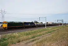 The 80 class were built by Alco's Australian licensee Comeng as an evolution of the 442 class. The 80 class were the first locomotives in Australia to feature factory-fitted cab air-conditioning and fibreglass body panels and the first in New South Wales delivered without buffing plates.[1] To reduce the need for repainting, the fibreglass panels were pre-coloured hence the class retained their original liveries for longer than had previously been the case.[2][3]
