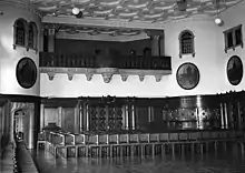 The western façade opposite the cemetery is less ostentatious. It has five gables and a round tower with a spherical copper-plated spire. Inside, the Great Hall to the right encompasses two storeys while the Tapestry Room and the Fireplace Room are in the three-storey section on the left. Above the symmetrically designed Main Portal, the Bremen coat of arms bears the inscription S•P•Q•B for Senatus populusque Bremensis (Senate and People of Bremen), as well as the inscription ÆDIFIC A°D° MDCCCCX (built in 1910).