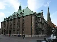 The New Town Hall (German: Neues Rathaus) has stood on the Domshof in the centre of Bremen, Germany since 1913. Located behind the Unser-Lieben-Frauen-Kirchhof cemetery, it is adjacent to the older section of the Town Hall with which it forms a harmonious ensemble. Among its sumptuous rooms decorated with local artefacts, the New Town Hall houses the Senate Chamber used by the Senate for its regular meetings and the Great Hall, a venue for official receptions. In 2004, Bremen Town Hall was listed as a UNESCO World Heritage Site, together with the Roland of Bremen, because of its outstanding architecture and testimony to the development of civic autonomy during the Holy Roman Empire.[1]