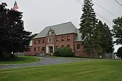 The NYS Armory is a historic former National Guard armory building located at Ticonderoga in Essex County, New York. It was built in 1934–1935 and is a large, two story T-shaped brick and case stone building with Tudor and Jacobean Revival style features. The main seven bay block has a steeply pitched, slate-covered hipped roof and is flanked by two bay wings.[2]