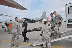 Airman assigned to the 139th Aeromedical Evacuation Squadron work alongside civilian agencies to carry a simulated patient, a Civil Air Patrol cadet, to an LC-130 aircraft.