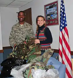 Senior Airmen Christopher George of the 914 Airlift Wing Raising 6 Organization presents 1st Lt. Tina Warnock of Civil Air Patrol, TAC Composite Squadron with surplus military uniforms.