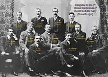 Some of the most prominent leaders of the party were English-born Frederick Cooke[2] and Ted Howard. Visitors from England were Tom Mann in 1902 and 1908 and Ben Tillett in 1907. Robert Rivers La Monte from America was (briefly) an organiser for the party: he was a member of the "Wobblies": the IWW Industrial Workers of the World.[3]