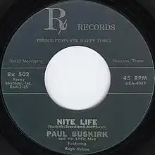 The song was rejected by Pappy Daily, who did not consider it country. Nelson, who owed Daily the recording of other songs, had sold "Night Life" for enough money to master the record at another studio. Daily threatened to sue Nelson if he pressed the song.[3] Nelson and Buskirk took the tapes from Gold Star Studios, and went to Bill Holford's ACA Studios to master the recording.[5] The song was recorded as "Nite Life," and credited to "Paul Buskirk and the Little Men featuring Hugh Nelson."[3] Released through Rx Records, few copies of the single were pressed,[5] and it received limited airplay by DJ Uncle Hank Craig on XEG.[6]
