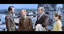 Peck, Ted Avery, Crawford, Marianne Koch shown in front of the Kaiser Wilhelm Memorial Church in the American Sector of Occupied Berlin (R2 DVD CinemaScope version)