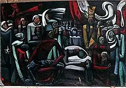 In 1949, Shin graduated from Tashkent's Benkov Art School, and began his career in painting, first receiving acclaim for his work in 1957, when he won the grand prize at the International Youth Festival in Moscow and the second prize in the Republican Festival of Young Artists of Uzbekistan.[3] In 1960, he graduated from Atropsky Art College, also in Tashkent; after his graduation, he began work on his painting Requiem, which would take him until 1982 to complete. Requiem, painted on a canvas three metres tall and forty-four metres wide in primary colors, depicts people without eyes, noses, or mouths; Shin has stated that this was meant to represent the sense of enslavement and namelessness felt by the Koryo-saram as a result of the deportations.[4] Following his completion of Requiem, Shin would go on to paint other works on the theme of the deportations and of Korean culture in Central Asia; he began to become well known in the West with his solo exhibition in Moscow in 1990, and another in Tashkent in 1991. Eventually, his art attracted the attention of the Central Asian-American Enterprise Fund, who offered him financial support, enabling him to hold further exhibitions.[3] His work was recognised by the Korean government in 1997, when they awarded him with the Order of Culture Merit (문화훈장); he then donated Requiem to the Museum of Contemporary Art.[2][6]