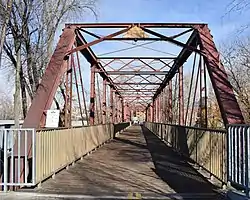 The Ninth Street Bridge in Boise, Idaho, also known as the Eighth Street Bridge, crosses the Boise River and is a 2-span, pin-connected Pratt through truss design constructed by the Missouri Valley Bridge & Iron Co. and completed in 1911. Each span is 160 ft (49 m) and includes six full panels and two end panels, supported by concrete piers at each end and midway in the river. Laced channel sections with cover plates form the upper chords, with eyebars on the lower chords. Eyebars with turnbuckles form the diagonals. The bridge was added to the National Register of Historic Places in 2001.[2]