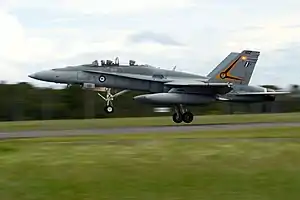 An F/A-18B taking off from RAAF Base Williamtown during Exercise Diamond Shield in March 2017; this exercise formed part of the air warfare instructor course[1]