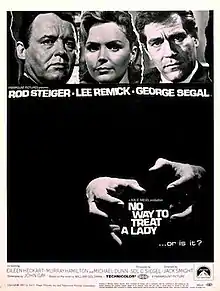 No Way to Treat a Lady is a 1968 American psychological thriller film with elements of black comedy, directed by Jack Smight, and starring Rod Steiger, Lee Remick, George Segal, and Eileen Heckart. Adapted by John Gay from William Goldman's 1964 novel of the same name, it follows a serial killer in New York City who impersonates various characters in order to gain the trust of women before murdering them.