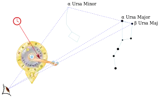 A nocturnal is an instrument used to determine the local time based on the relative positions of two or more stars in the night sky. Sometimes called a horologium nocturnum (time instrument for night) or nocturlabe (in French and occasionally used by English writers), it is related to the astrolabe and sundial. Knowing the time is important in piloting for calculating tides and some nocturnals incorporate tide charts for important ports.