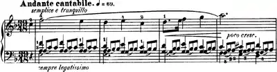 time. The first section, marked Larghetto, features an intricate, elaborately ornamental melody over an even quaver bass. The second section, labeled doppio movimento (double speed), resembles a scherzo with dotted quaver-semi quaver melody, semiquavers in a lower voice in the right hand, and large jumps in the bass. The final section is a shortened version of the first (14 bars rather than 24) with characteristic cadenzas and elaboration, finishing with an arpeggio on F major, falling at first, then dying away. Many consider this nocturne to be the best of the opus, stating that its musical maturity matches some of his later nocturnes."[2] Pianist Theodor Kullak remarked about this piece, "The return of the heavenly opening theme... touches [one] like a benediction."[2]