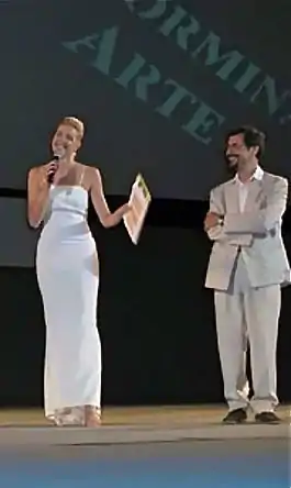 Film director Mahmoud Shoolizadeh in the Taormina International Film Festival 2003, on stage being introduced to the audience.