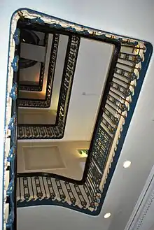 Little original work survives inside. There is cantilevered four-storey staircase with balusters made of cast iron and decorated with monograms (viz "NH") and openwork. The original "ascending omnibus" lift was part of the same structure; the gates survive. Near the staircase is a glazed dome with arabesque patterns.[17][1]