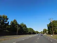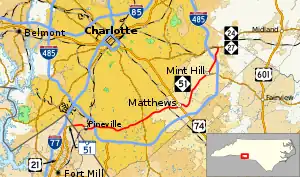 Though NC 51 begins at the state line, SC 51 is a short 1-mile-long (1.6 km) road that connects with US 21, near Fort Mill, South Carolina. Crossing the state line, NC 51 quickly becomes a four-lane road as it goes through the town of Pineville. After its first intersection with I-485, it enters the Charlotte city limits. In Charlotte, NC 51 crosses the busy intersections of Johnston Road and Providence Road, known for rush-hour traffic during the weekdays. In Matthews, NC 51 bypasses the main downtown area, followed by a semi-controlled interchanged with US 74 (Independence Boulevard). As the NC 51 enters Mint Hill, the road narrows to two-lane. NC 51 crosses intersects I-485 again, before ending at NC 24/NC 27 (Albemarle Road).[2][1]