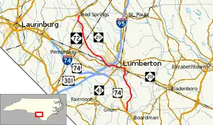 North Carolina Highway 72 (NC 72) is a primary state highway in the U.S. state of North Carolina that serves the communities of Red Springs and Lumberton. The east–west-signed highway physically runs more north and south through Robeson County.