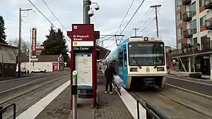 North Prescott Street is a light rail station on the MAX Yellow Line in Portland, Oregon. It is the 4th stop northbound on the Interstate MAX extension.