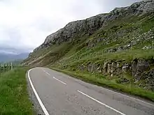 The area contains a number of limestone caves. The most well known of these is Smoo Cave, a large sea cave near Durness. This cave is unique within the UK in that its outer chamber was formed by the action of seawater, while the inner chambers were formed by fresh water.[11] Its entrance 15 metres high, is the largest entrance of any sea cave in the British Isles.[12] Archaeological excavations have found evidence of human habitation dating back to the Mesolithic period.[13] The cave became well known after Sir Walter Scott visited it in 1814. Another notable cave site is the Inchnadamph Bone Caves. At these caves, remains of Eurasian lynx, brown bear, Arctic fox, reindeer and polar bears have been found; as well as human remains dated between 4,515 and 4,720 years old.[14] Uamh an Claonaite, Scotland's longest cave is partly located below these Bone Caves.