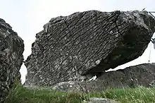 The Moine Thrust Belt was formed between 430 and 500 million years ago. The belt includes Precambrian Moine rocks which have been pushed on top of younger Cambrian and Ordovician rocks, much to the surprise of Victorian geologists.[6][7] A debate ensued between prominent geologists of the time. Roderick Murchison and Archibald Geikie argued that the Moine rocks must in fact be younger than the rocks beneath them, a point of view opposed by James Nicol and Charles Lapworth. The controversy, the so-called "Highlands Controversy", was resolved by Ben Peach and John Horne who found that the Moine rocks had been pushed some 70 kilometres east over the top of the younger rocks by tectonic action. This was the first thrust fault to be discovered.[8] A monument to the pair is located within the park. Its inscription reads: To Ben N Peach and John Horne who played the foremost part in unravelling the geological structure of the North West Highlands 1883–1897. An international tribute. Erected 1930.[9] The fault can be seen most easily at a line of cliffs named Knockan Crag. This crag is where the Moine is where the apparent anomaly in the ages of the rocks was first seen, and is where the thrust belt was first identified. A visitor's centre is located here, as well as several pieces of sculpture created by modern artists.[10]