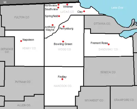 • The Great Northern Conference had been created in 1945 with Oregon Clay, Maumee, Perrysburg, Rossford, Sylvania and Toledo Whitmer as its charter members.[1] Anthony Wayne would join them in 1953. League expansion was brought up in 1956 as Bowling Green, Fostoria, Swanton, Oak Harbor, Genoa, Lake, Port Clinton, Toledo Rogers and Holland were considered for membership. The GNC eventually grew and split into two divisions based on size— Orange: (Bowling Green, Clay, Fostoria, Toledo Rogers, Sylvania, and Toledo Whitmer) and Blue: (Anthony Wayne, Genoa, Maumee, Perrysburg, Port Clinton and Rossford). The names were changed in 1957, with the Orange Division becoming the Great Lakes League and the Blue Division becoming the Northern Lakes League.[2]
