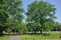 The Northfield Center Cemetery is located a short way west of the town center, at the western end of Parker Avenue. It is bounded on the east by a railroad right of way, and on the west by a wooded embankment leading down to the flood plain of the Connecticut River. It is 7.64-acre (3.09 ha) in size, and consists of roughly level ground, fringed with trees on the three sides not abutting the railroad tracks. The main entrance is at the southeast corner, and a narrow paved road provides a roughly oval circulation pattern through the grounds.[2]