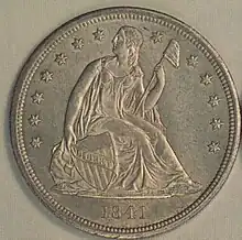 United States Seated Liberty coinage was the silver coin design minted in the mid-to-late 19th century. It was the first seated-portrait U.S. coin, now-scarce Seated Liberty Dollar, and debuted in 1836. The seated liberty dime and seated liberty half dime followed the next year in 1837 and the seated liberty quarter and seated liberty half dollar in 1839.