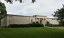 The cemetery is also home to several private mausoleums. William D. Petersen was the son of J.H.C. Petersen who founded a department store in Davenport that has become Von Maur. He also was responsible for the development of the city's riverfront and built the LeClaire Park Bandshell there. His mausoleum was designed in the Gothic Revival style by Davenport architects Rudolph Clausen & Walter Kruse. It was inspired by his wife Sara's desire for a tomb similar to the ones she saw in Europe. It was constructed by Presbrey Leland of Valhalla, New York in 1921 for $60,000.[11] The exterior is composed of limestone from Greece. The interior features crypts that were carved from Greek marble and a ceramic tile ceiling that was designed and completed by the Guastavino Tile Company of Woburn, Massachusetts.