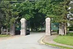The cemetery entrance is marked by a set of monumental gates, designed in the Art Nouveau style by Davenport architect Edward Hammatt in 1895. Construction of the gates was completed in 1896.[10]