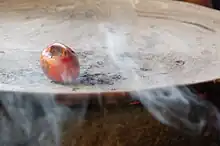 Clean grasshoppers are cooked by immersing them into boiling water seasoned with garlic and lime.[10] The most common way to eat them is fresh off the comal and with a tortilla, but they are also eaten fried with chili powder as a snack (especially with mezcal) and can be found in more sophisticated preparations, in a sauce or mixed with eggs.[10][13]