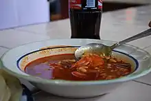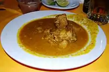 The name, color and ingredients distinguish the seven main moles of Oaxaca, called negro (black), amarillo (yellow), coloradito (little red or red-colored), mancha manteles (tablecloth stainer), chichilo (named after the main pepper), rojo (red) and verde (green).[14] All of the moles, except verde, can be kept as a paste and cooked later diluted with chicken broth.[2] Mole negro is the best known and most complicated of the preparation, containing anywhere from twenty to thirty-plus ingredients, depending on the recipe.[2][13] Mole negro is slightly sweet, black in color and contains six different types of chili peppers, plantains, onion, tomatoes, tomatillos, cloves, cinnamon, chocolate, nuts, tortillas, avocado leaves and more depending on the recipe. To gain the desired black color, the chili peppers have to be well toasted but not burnt. Mole amarillo contains green tomatoes, onion, garlic, cumin, cloves, ancho chili peppers, guajillo chili peppers, hoja santa or cilantro and is garnished with onions, lime and oregano. Mole coloradito is brick red in color and contains ancho chili peppers, tomatoes, garlic, sesame seeds, almonds, cinnamon and oregano. Mancha manteles is red and uses ancho chili peppers, tomatoes, garlic, onion, thyme, cloves and almonds. Another red mole is chichilo, which uses chihuacle, negro, pasilla and mulato chile peppers, tomatoes, marjoram, allspice, cloves and avocado leaves. Rojo is red as its name suggests with ingredients such as chocolate, guajillo chili peppers, onion, tomatoes, garlic, oregano, nuts and sesame seeds. Mole verde contains tomatillos, green chili peppers, onion, garlic, cumin, cloves, ancho and guajillo chili peppers, hoja santa, epazote and parsley. It has a light and herby taste.[2][14] Of the sauces, verde is the easiest to create as it does not require the toasting and rehydration of chili peppers.[14]