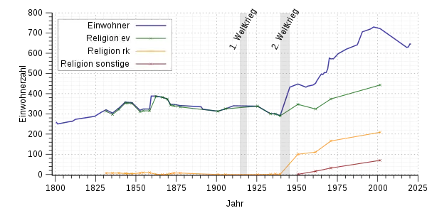 In 1538 there were 6 houses in the hamlet. At the beginning of the Thirty Years' War in 1618, 40 families lived in 24 houses, by 1648 it had been reduced to 10 houses with 8 families. By 1708 the village grew to 25 houses.