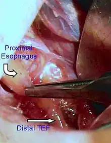 - ↑ Kunisaki SM, Foker JE (June 2012). "Surgical advances in the fetus and neonate: esophageal atresia". Clinics in Perinatology. 39 (2): 349–61. doi:10.1016/j.clp.2012.04.007. PMID 22682384.