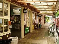 The station has an island platforms serving two tracks connected to a small station building by a level crossing. The station is staffed.