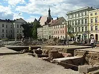 Most interesting discoveries were made during a 2010 archaeological campaign, realized prior to the launching of reconstructions linked to Bydgoszcz Urban Revitalization Plan. These excavations unveiled well-preserved foundations of the former gothic town hall (e.g. vaulted cellars) once standing in the middle of Old Market square, basements of the town hall tower and merchant stalls. In addition, traces of settlement dating back to the 12th century and elements of Iron Age Pomeranian culture period have been found.[4]